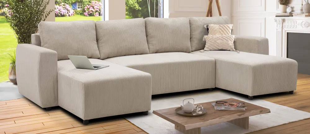 Canapé convertible panoramique 7 places PHARELL – Velours côtelé : un modèle convertible, revêtement en velours, velours côtelé, pensé pour optimiser votre espace et votre confort au quotidien. Disponible en variantes : Couleur: Beige, Gris . Atouts clés : coffre de rangement intégré, suspension à ressorts pour un meilleur maintien, assise en mousse résiliente, structure en bois durable, dimensions pensées pour un salon familial.