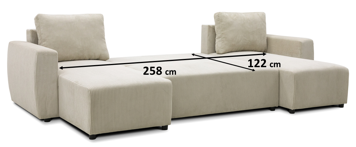 Nom du produit Canapé convertible panoramique PHARELL 7 places – Velours côtelé beige – Coffre de rangement – L297 x P155 x H85