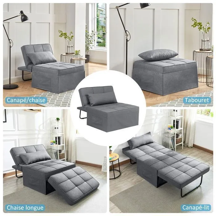Canapé-lit avec oreiller, 4 en 1 chaise-lit à dossier réglable, coussin en éponge doux et épais avec canapé-lit convertible. cette chaise convertible peut être facilement et rapidement transformée pour répondre à vos différents besoins. Vous pouvez l’utiliser comme lit d’appoint, chaise longue, canapé ou pouf. Pratique et étroit, ce fauteuil convertible monoplace s’adapte à tous les coins du bureau, du salon ou de la chambre d’amis.