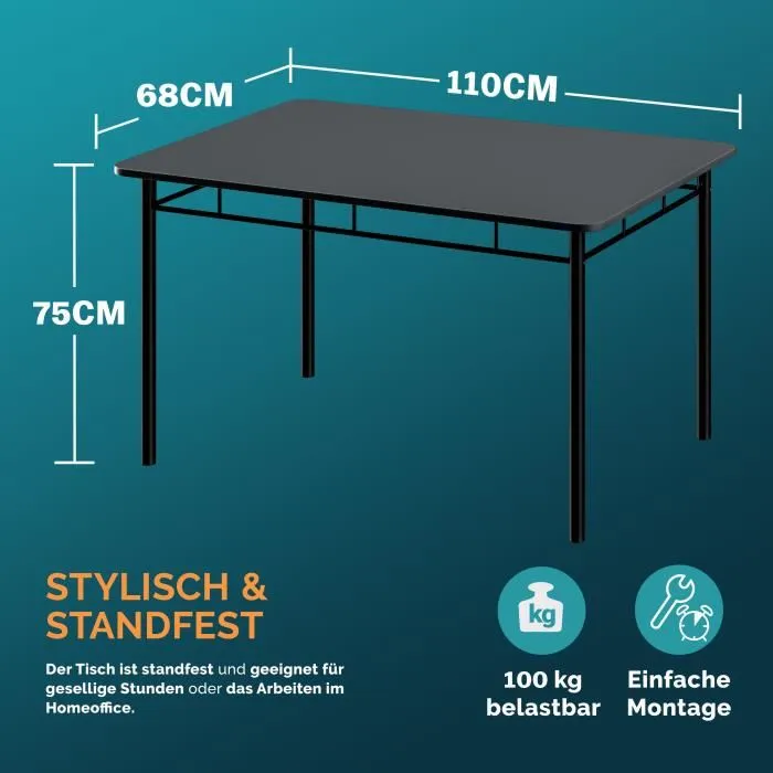 La structure en métal thermolaqué de style industriel ajoute une touche de modernité à l’ensemble.RÉSISTANT ET STABLEL’ensemble de meubles n’est pas uniquement esthétique, il est également durable. Les chaises offrent confort et stabilité et la table permet de partager des moments de convivialité. Polyvalente, elle peut aussi être utilisée comme bureau en télétravail. La table peut supporter jusqu’à 100kg et une chaise, 125kg.CONFORTABLELes bords arrondis ajoutent de l’élégance et de la sécurité, notamment en présence d’enfants. Les hauteurs d’assises et de dossiers permettent de rester assis confortablement pendant des heures.FACILE À ENTRETENIR ET ROBUSTEL’ensemble de salle à manger est pratique et facile à entretenir. Les surfaces en fibre de bois MDF sont lavables et les protections de pieds protègent vos sols. L’ensemble de meubles vous accompagnera dans vos moments de convivialité, dans vos soirées jeux de société ou pendant des heures de travail.GAIN DE PLACELes chaises, aux dimensions compactes, peuvent être rangées sous la table lorsqu’elles ne servent pas. Un véritable gain de place ! Les meubles se montent facilement et rapidement, vous pourrez vous en servir dès le jour de sa réception.Avantages du produit : * Grand confort d’assise et grand espace * Design intemporel, facile à combiner * Matériaux de haute qualité et durable * Stable et robuste * Grande capacité de charge * Facile à entretenir et nettoyer * Surfaces hydrofuges * Bords arrondis * Montage facile et rapide * Structure aspect industriel * Protections en plastique pour les pieds de la table et des chaisesCaractéristiques techniques : * Matériau des assises et plateau de table : panneaux en fibre de bois MDF de 15 mm * Matériau structure : métal thermolaqué * Dimensions de la table (LxlxH) : 110 x 68 x 74,5 cm * Dimensions des chaises (lxpxH) : 37 x 44 x 86,5 cm * Hauteur du dossier de l’assise : 46 cm * Hauteur de l’assise : 44 cm * Capacité de charge max. de la table : 100 kg * Capacité de charge max d’une chaise : 125 kg * Couleur : anthraciteContenu de la livraison : * 1x Ensemble table et 4 chaises