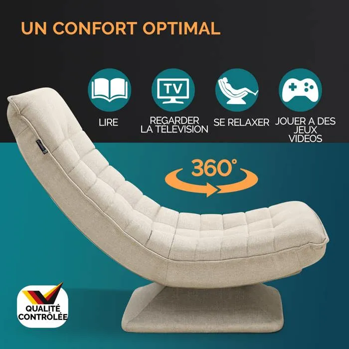 Le fauteuil de relaxation est polyvalent : il peut être tourné à 360°. De par sa configuration pratique, vous pouvez le placer comme bon vous semble : face à un extérieur avec vue sur le jardin, en face d’une bibliothèque ou d’un écran en l’utilisant comme siège de gaming. Très pratique, il se balance également d’avant en arrière pour vous offrir un moment de détente et de confort.