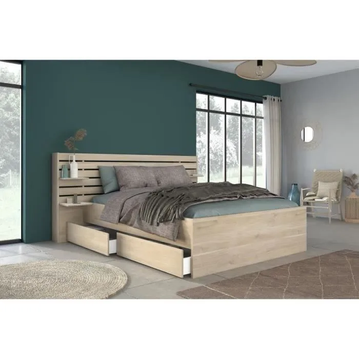 | Description du produit | Lit enfant ESCALE 90×190/200 cm – Décor chêne – Tête de lit + 2 tiroirs – L121,5 x H88,6 x P216,8 cm |
