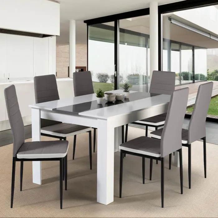 Les lignes sobres de cette table apporteront une ambiance à la fois tendance et chic à votre intérieur !Ses coloris intemporels blanc et gris se marieront facilement avec votre intérieur. La finition laquée de sa partie centrale façon chemin de table en MDF gris lui apporte un effet lumière des plus élégants.Stable et robuste, cette table à manger GEORGIA moderne va devenir l’élément central de votre salle à manger et s’associera parfaitement avec nos 6 chaises ROMANES grises liseré blanc.Tout aussi faciles d’entretien que la table 140 cm grâce à leur revêtement en PVC, ces chaises présentent un design épuré très moderne souligné par leurs pieds en métal peints en noir.Idéal pour la cuisine ou la salle à manger, ce lot de 6 chaises offre en effet un confort optimal grâce à leur rembourrage et leur haut dossier matelassé.N’hésitez plus et surprenez vos invités avec cet ensemble table à manger GEORGIA et 6 chaises ROMANES !Dimensions de l’ensemble table GEORGIA et 6 chaises ROMANESDimensions de la table : Longueur 140 cm x largeur 90 cm x Hauteur 75 cmDimensions des pieds : L. 10 x l. 10 x H. 73,5 cmEspace entre les pieds sur la longueur : 116 cmEspace entre les pieds sur la largeur : 66,5 cm4 pieds en bois8 patins de protection au piétement fournisDimensions: Longueur 42 cm x largeur 48 cm x Hauteur 97 cmRevêtement assise PVCPieds métal peints en noirÀ monter soi-mêmeRetrouvez nos ensembles table GEORGIA et chaises ROMANE sur notre boutique en ligne :- Table à manger GEORGIA 140 cm façon hêtre et noire et 6 chaises ROMANE noires- Table à manger GEORGIA 140 cm blanche et noire et 6 chaises ROMANE noires liseré blanc- Table à manger GEORGIA 140 cm blanche et grise et 6 chaises ROMANE grises