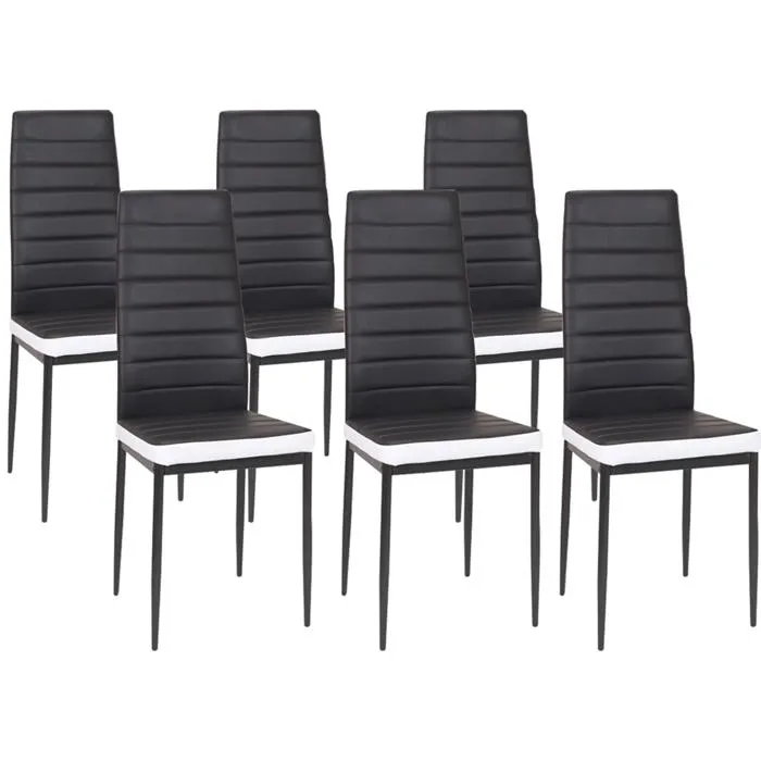 Les lignes sobres de cette table apporteront une ambiance à la fois tendance et chic à votre intérieur !Ses coloris intemporels blanc et noir se marieront facilement avec votre intérieur. La finition laquée de sa partie centrale façon chemin de table en MDF noir lui apporte un effet lumière des plus élégants.Stable et robuste, cette table à manger GEORGIA moderne va devenir l’élément central de votre salle à manger et s’associera parfaitement avec nos 6 chaises ROMANES noires liseré blanc.Tout aussi faciles d’entretien que la table 140 cm grâce à leur revêtement en PVC, ces chaises présentent un design épuré très moderne souligné par leurs pieds en métal peints en noir.Idéal pour la cuisine ou la salle à manger, ce lot de 6 chaises offre en effet un confort optimal grâce à leur rembourrage et leur haut dossier matelassé.N’hésitez plus et surprenez vos invités avec cet ensemble table à manger GEORGIA et 6 chaises ROMANES !Dimensions de l’ensemble table GEORGIA et 6 chaises ROMANEDimensions de la table : Longueur 140 cm x largeur 90 cm x Hauteur 75 cmDimensions des pieds : L. 10 x l.10 x H. 73,5 cmEspace entre les pieds sur la longueur : 116 cmEspace entre les pieds sur la largeur : 66,5 cm4 pieds en bois8 patins de protection au piétement fournisÀ monter soi-mêmeDimensions d’une chaise : Longueur 42 cm x largeur 48 cm x Hauteur 97 cmRevêtement assise PVCPieds métal peints en noirÀ monter soi-mêmeRetrouvez nos ensembles table GEORGIA et chaises ROMANE sur notre boutique en ligne :- Ensemble table à manger GEORGIA 140 cm façon hêtre et noire et 6 chaises ROMANE noires- Ensemble table à manger GEORGIA 140 cm blanche et grise et 6 chaises ROMANE grises