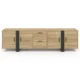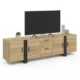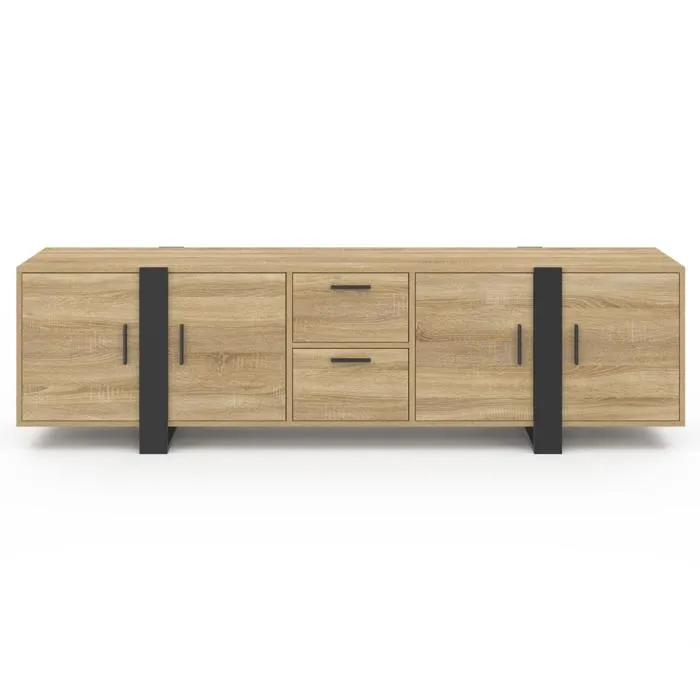 À la recherche d’un meuble TV design pour aménager votre salon ? Découvrez le meuble TV PHOENIX ! Doté d’un long plateau de 180 cm et de pieds massifs noirs au style industriel, il apportera du cachet à votre intérieur !Ce meuble TV avec rangement s’intégrera parfaitement à tous types de décorations intérieures. Dotés de deux tiroirs et de deux grands placards, vous pourrez y ranger de nombreux objets. Cela vous permettra de garder votre espace de vie organisé. Avec son long plateau de 180 cm, le meuble TV PHOENIX vous permet d’accueillir un écran plat jusqu’à 70 pouces ainsi que télécommandes ou petits objets de décoration !Des trous passe câbles sont faits pour y glisser les fils de votre TV ou de votre console. Les pieds larges reliés entre eux et la structure en particules de bois de ce meuble TV vous assurent stabilité et robustesse pour accueillir votre matériel hi-fi.Vous recherchez un meuble design pour l’accorder avec votre meuble TV design noir et bois ? Pour un look harmonieux, choisissez l’une des tables basses de la collection PHOENIX, qu’elle soit avec tiroirs ou avec plateau relevable.Le meuble télé avec tiroirs et placards PHOENIX 180 cm s’invite dans votre intérieur pour une ambiance chaleureuse garantie, le tout à prix mini !Dimensions du meuble TV noir et bois PHOENIXDimensions globales : Longueur 180 cm x largeur 40 cm x Hauteur 50 cmDimensions d’une porte : Longueur 30 cm x Hauteur 39 cmDimensions d’un tiroir : L. 31 x H. 18,5 cmDimensions des placards : Longueur 71 cm x Profondeur 33,5 cm x Hauteur 39,5 cmHauteur des pieds : 7,5 cm2 trous passe câblesMatériaux : Panneaux de particulesColoris : bois et métal noirÀ monter soi-mêmeRetrouvez l’ensemble de notre collection industrielle et de nos meubles TV sur notre site.