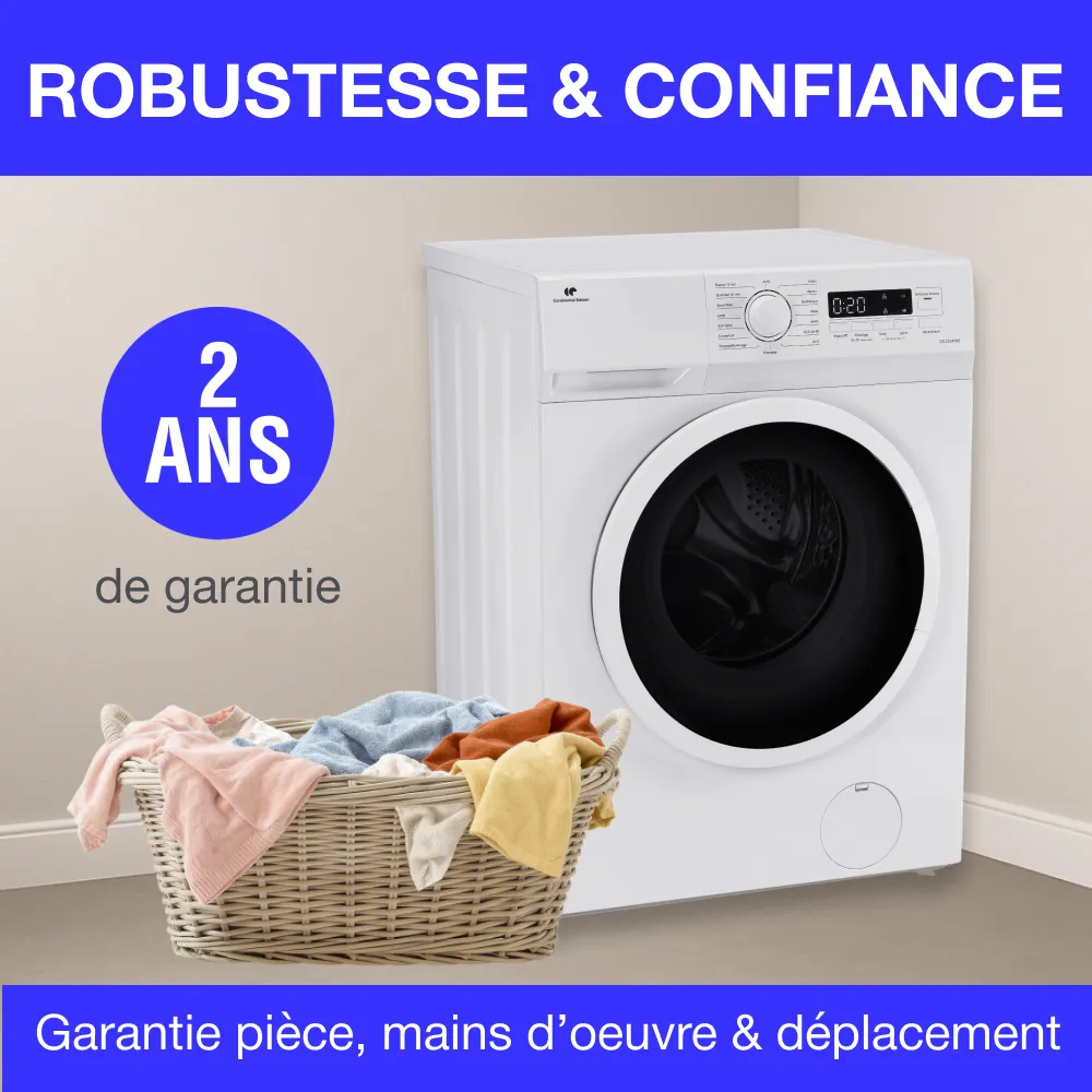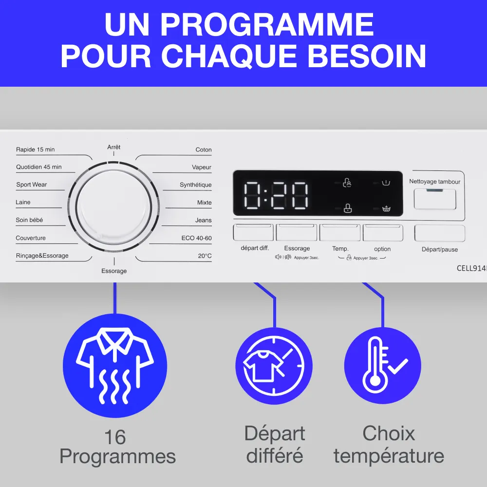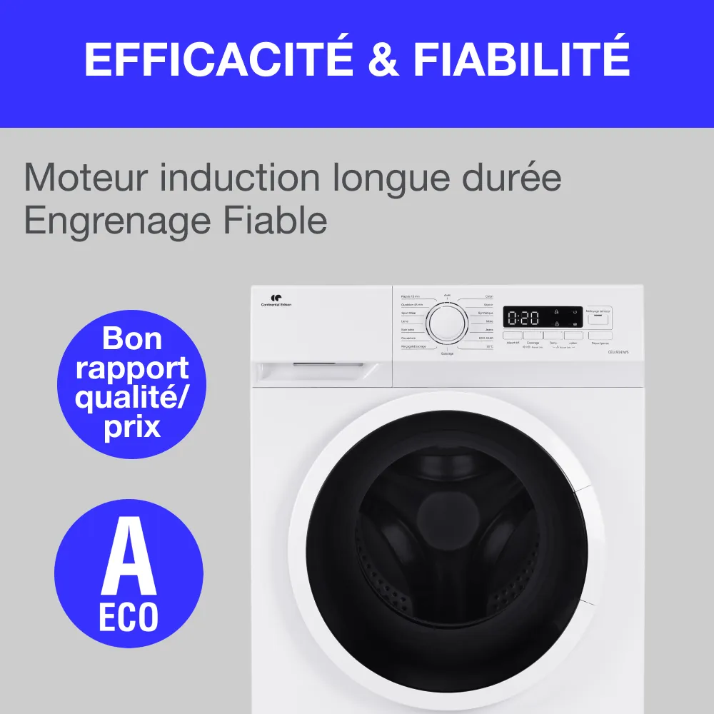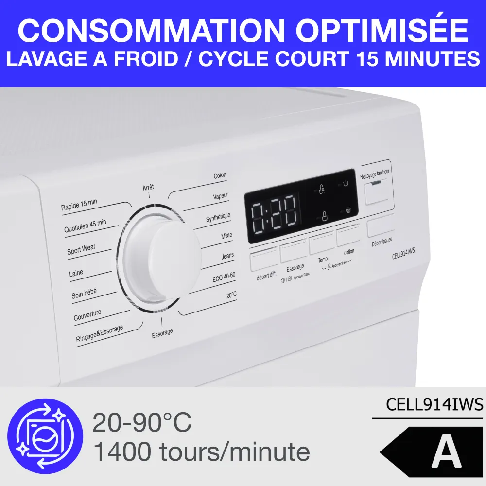 Ce lave linge frontal est prévu pour une pose libre afin de le placer aisément dans la pièce de votre choix. D’une capacité de 9 kg avec un moteur induction, classe énergétique A, il convient parfaitement pour une grande famille ou pour le lavage de textile de maison telle que les couettes ou couverture. Son essorage variable jusqu’à 1400tours/min et ses 15 programmes répondrons à chaque besoin du quotidien. Il est équipé d’un départ différé pour un fonctionnement à l’heure souhaité, pour privilégier les heures creuses et ainsi réaliser des économies ou pour que votre lessive soit prête à votre retour ou votre réveil. Son tambour alvéolé prendra le plus grand soin du linge en réduisant les frottements. Ce lave-linge hublot CONTINENTAL EDISON CELL914IWS est doté d’une capacité de 9 kg et d’un moteur induction. Il offre une vitesse d’essorage maximale de 1400 trs/min et dispose de 15 programmes pour répondre à tous vos besoins. Sa classe énergétique A garantit une consommation réduite. Son départ différé vous permet de programmer le lavage à l’heure souhaitée.