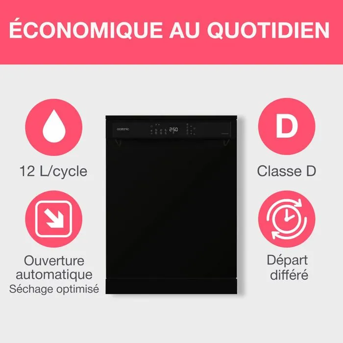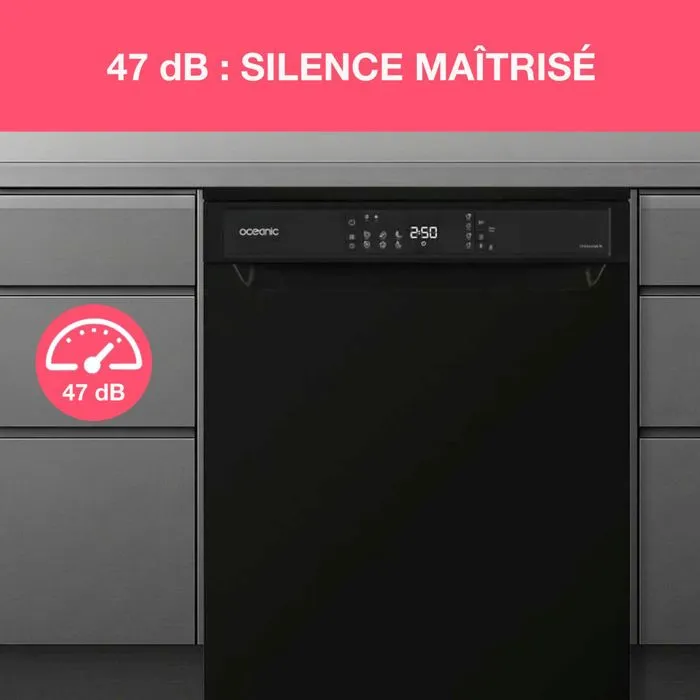 | Nom du produit | Lave-vaisselle pose libre OCEANIC OCEALV1247B – 12 couverts – 47 dB – Noir |