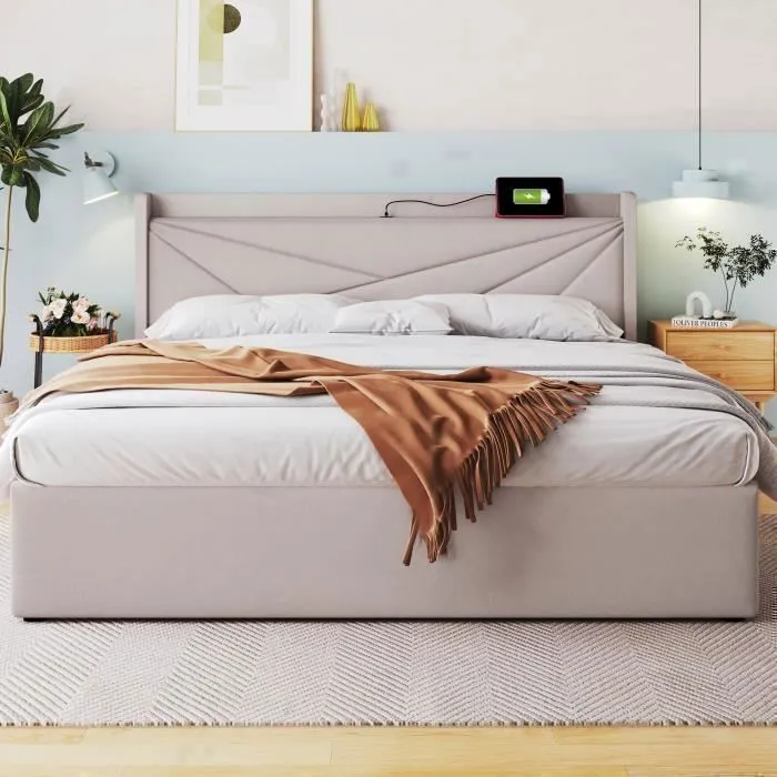 | Nom du produit | Lit coffre 160×200 cm – USB et type C – Lit double pour 2 personnes – Sommier à lattes – Tissu Lin beige |
