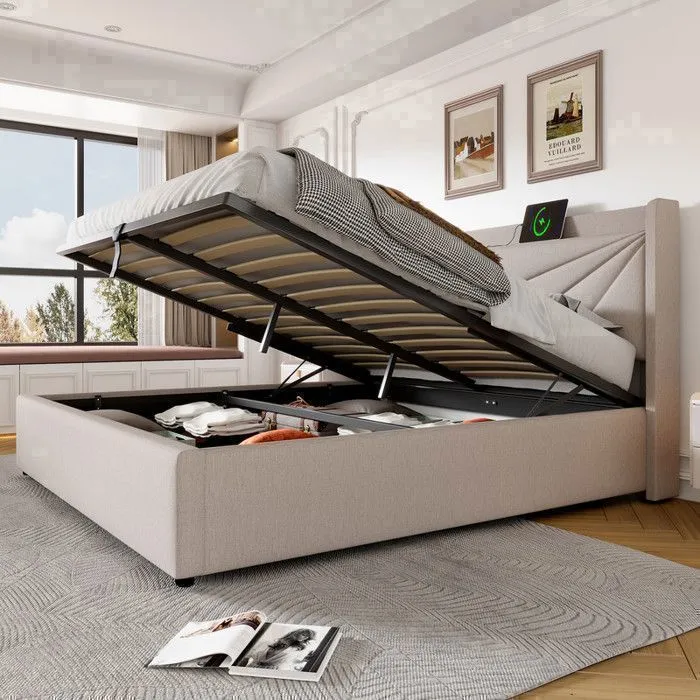 Ce lit coffre 160×200 cm est équipé d’un chargement USB et type C, d’un sommier à lattes et d’un revêtement en tissu Lin beige. Sa tête de lit géométrique, sa fonction de charge intégrée, sa construction solide, son design de rangement et sa capacité de charge de 300 kg en font un lit moderne et pratique.