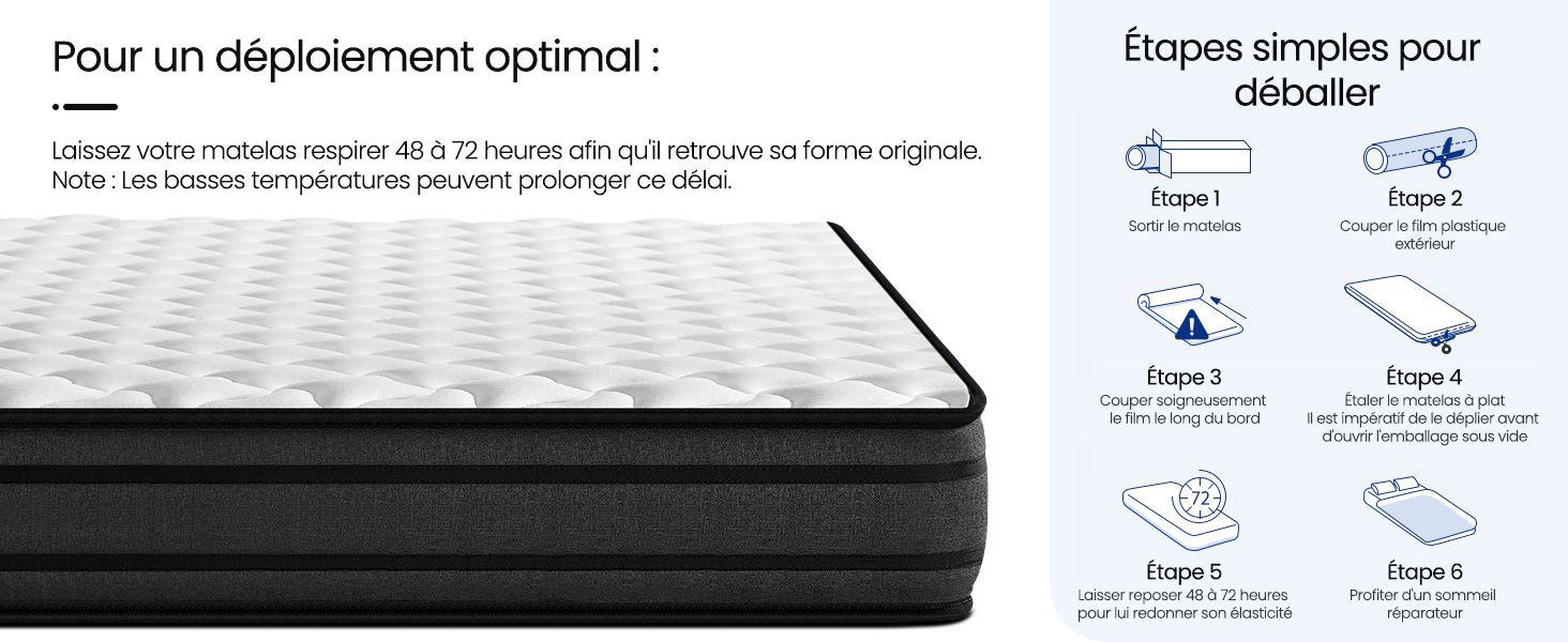 • Nous recommandons d’attendre 72 heures pour permettre au matelas de retrouver sa hauteur originale. Notre matelas mesure 25cm (+/-2cm).