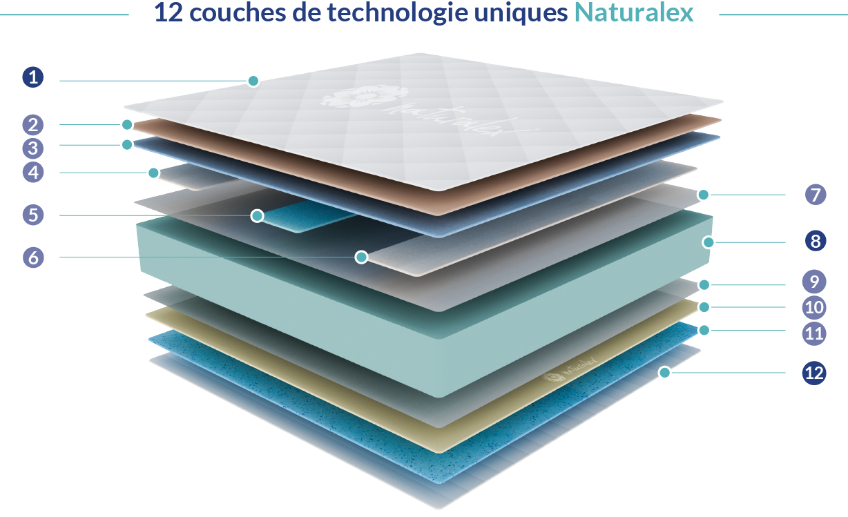7) Tissu protecteur et respirant 8) Mousse haute densité ferme 23 kg/m³ 9) Tissu protecteur et respirant 10) Mousse de support souple 11) Mousse à mémoire avec gel actif 40 kg/m³ (selon le modèle) 12) Tissu 3D thermo-régulateur et élastique en polyester |