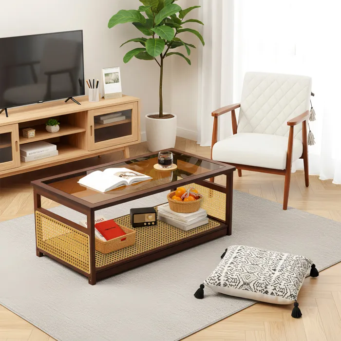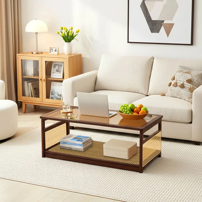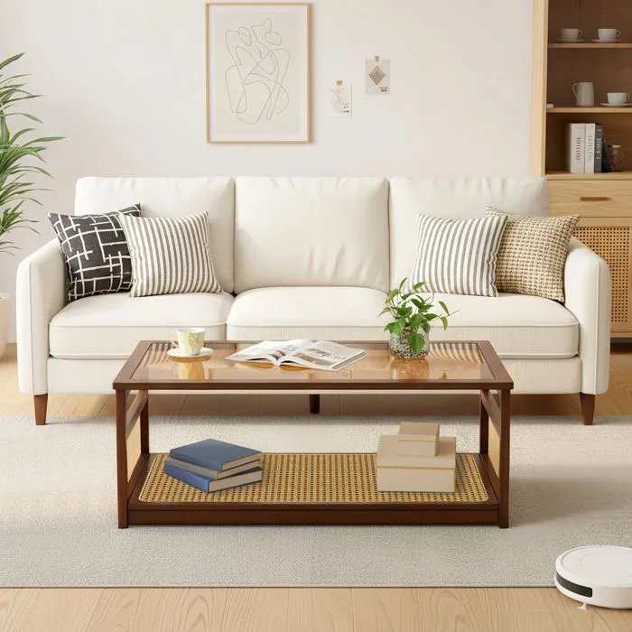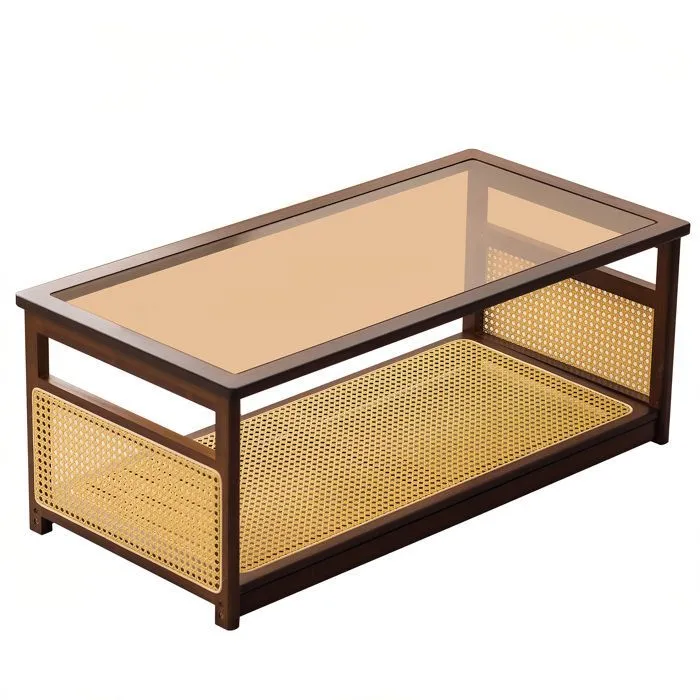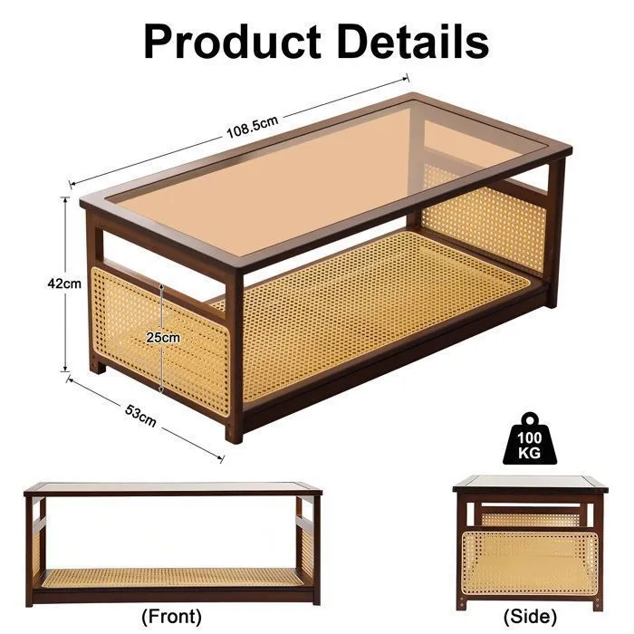 | Nom du produit | Table basse , 108,5 x 53 x 42 cm, double couche, table d’appoint bambou pour canapé, tressage de rotin, Couleur bois de noyer |