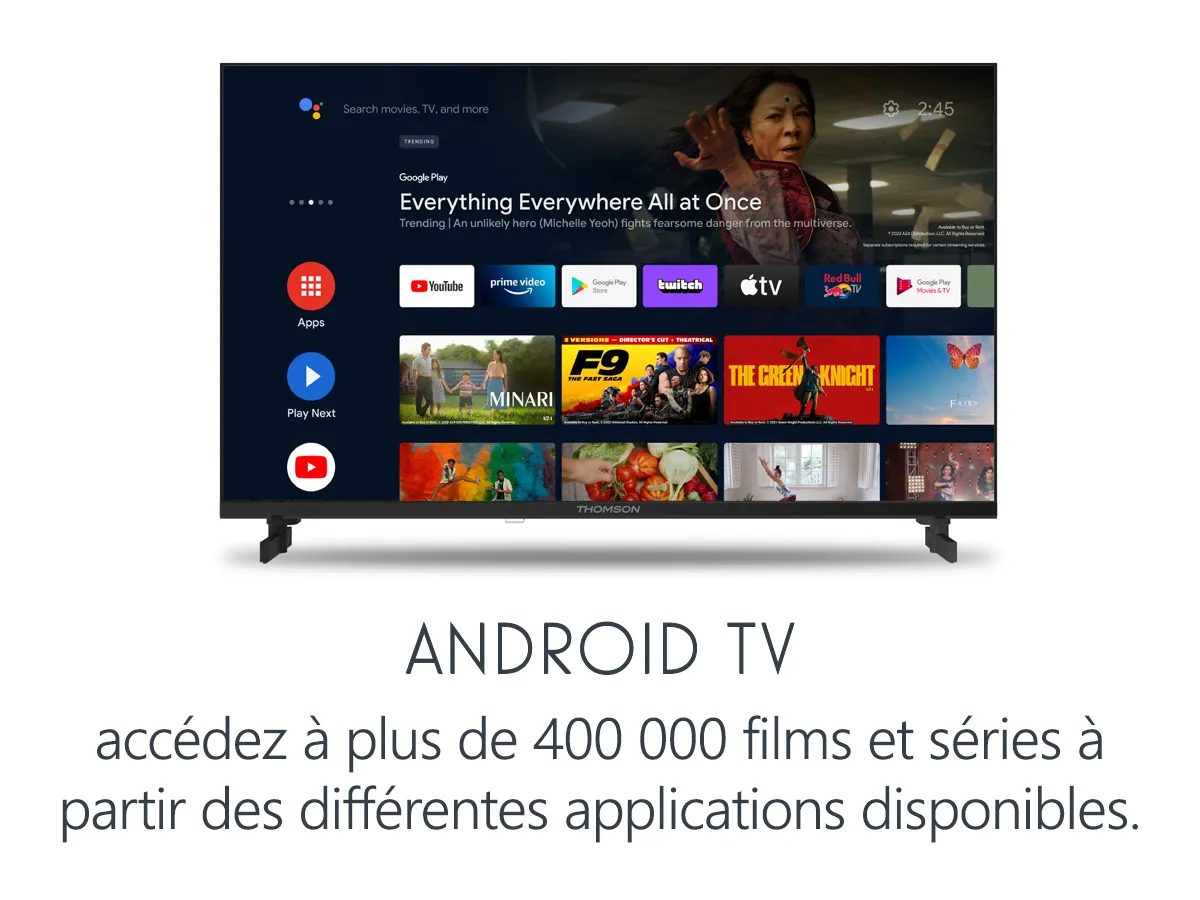 Android TV rend votre expérience télévisuelle encore plus pratique: accès à plus de 400 000 films et émissions de télévision à partir des nombreuses applications disponibles, contrôle vocal intelligent avec Google Assistant, Chromecast intégré pour diffuser sans fil des films, de la musique et des vidéos à partir d’appareils compatibles. Et avec le bouton “Favoris” de votre télécommande, accédez rapidement à votre application préféré.