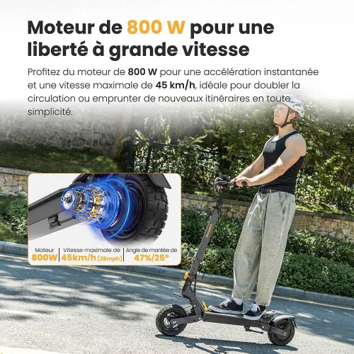 La trottinette électrique Ausom L1 est équipée d’un moteur à Pic 1100W qui offre une accélération rapide et une vitesse de pointe de 45 km/h (28 mi/h). Que vous vous déplaciez en ville ou que vous vous aventuriez hors route, elle se conduit avec aisance, même sur des pentes de 25°, vous permettant de gravir des côtes ou de doubler la circulation sans hésitation.