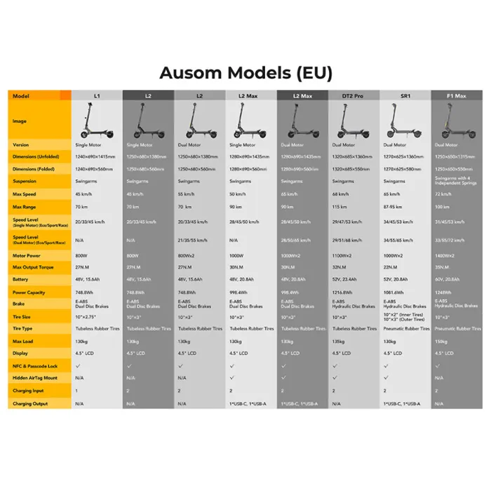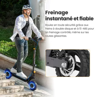 La Ausom L1 est une trottinette électrique puissante et endurante, pensée pour les utilisateurs adultes recherchant confort et performance. Son moteur atteignant jusqu’à 1100 W en pic, associé à une batterie 48V 15,6Ah, permet une autonomie pouvant atteindre 70 km. Dotée de pneus tubeless 10″, d’une suspension à bras oscillant, d’un système de freinage E-ABS + disques avant/arrière et d’un large écran LCD avec NFC, elle offre une conduite stable, sécurisée et agréable. Robuste, pliable et capable de supporter jusqu’à 130 kg, elle constitue un excellent choix pour les trajets privés longs, les déplacements quotidiens et les surfaces variées.