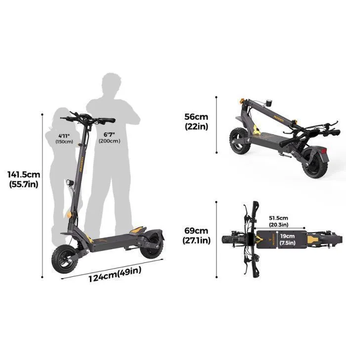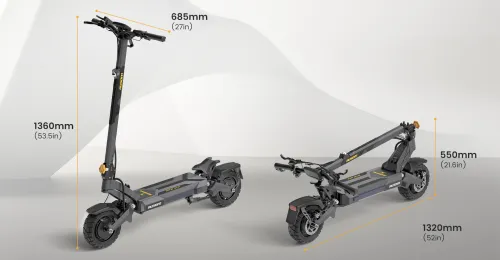 Dimensions déplié : 1 240 × 690 × 1 415 mmDimensions plié : 1 240 × 690 × 560 mmPoids net : 28,2 kgLongueur du guidon : 690 mmProfondeur du repose-pieds : 250 mmProfondeur du repose-pieds : 180 mmDimensions du repose-pieds : 515 × 190 mmTaille recommandée pour les cyclistes : 150 cm-200 cmAscendance : 47 % / 25°Charge maximale : 130 kgÉtanche Niveau : IP54Matériau du cadre : Acier inoxydableAutonomie : 70 kmType de freinage : ABS électronique + freins à disque avant et arrière