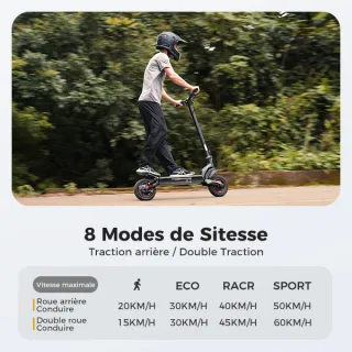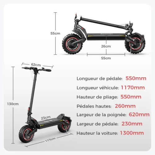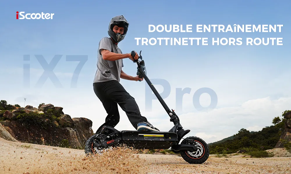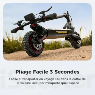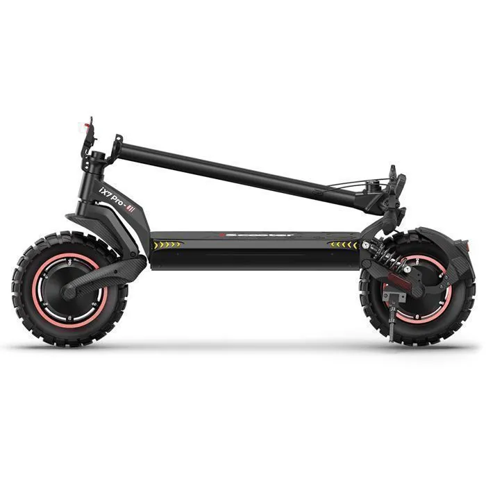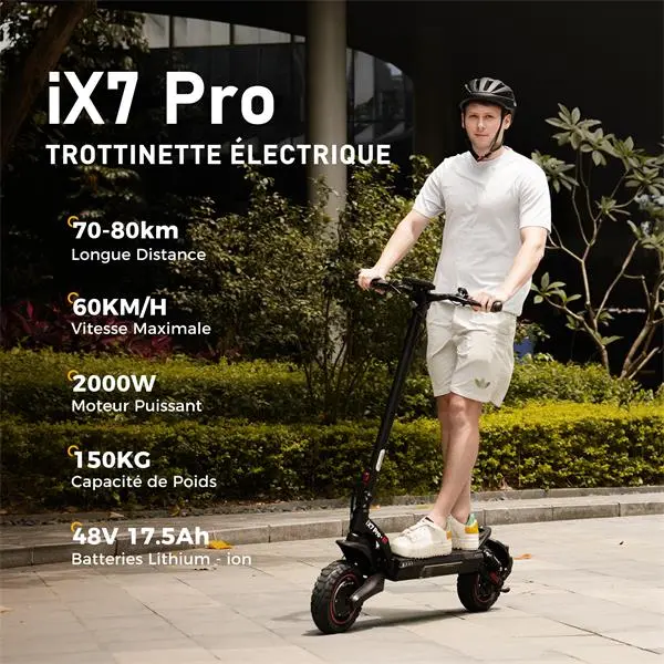 | Description du produit | iX7Pro : scooter tout-terrain à double moteur 1000W. Autonomie 80 km, vitesse max 60 km/h, charge 8h, pliant (117x65x55 cm), 29.7 kg, certifié CE. |