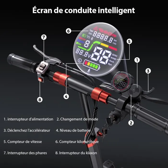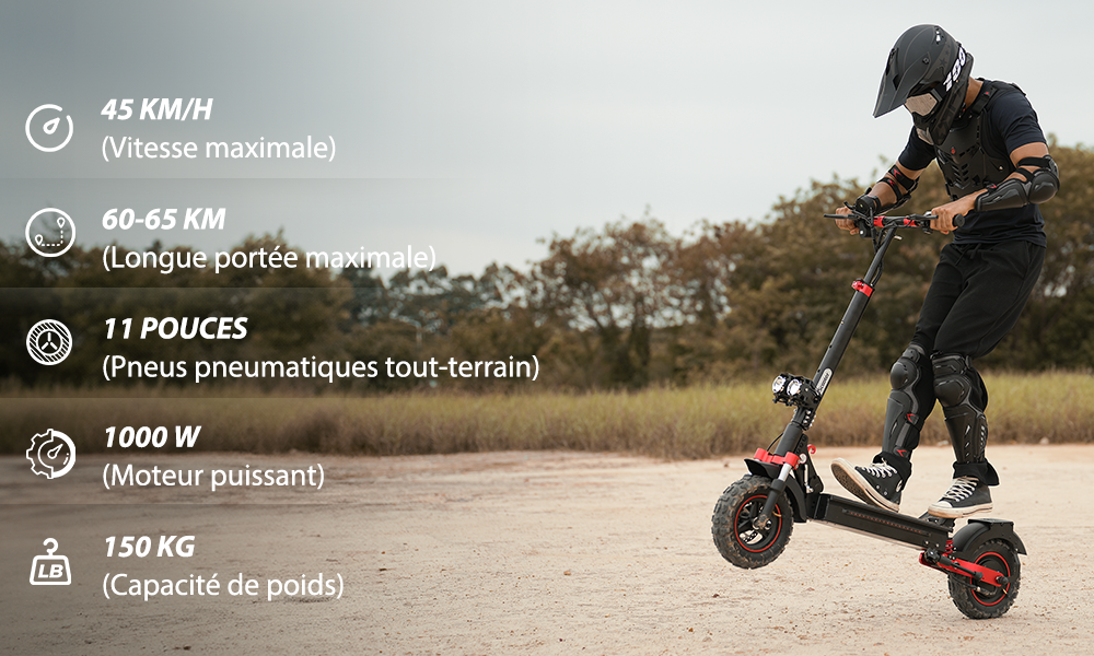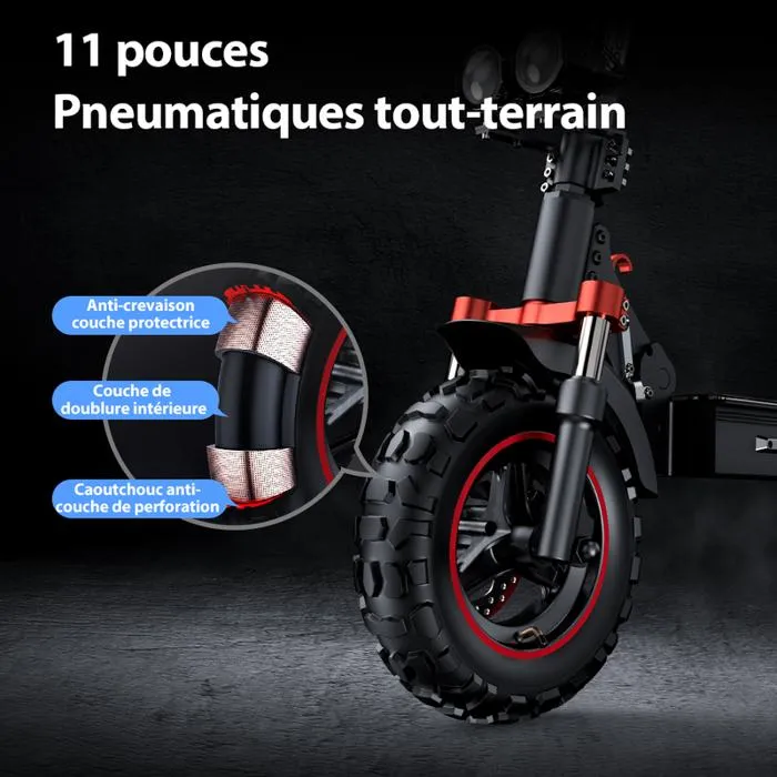 Le moteur de 1000W garantit une accélération rapide et une conduite dynamique, même dans des conditions exigeantes. Avec sa batterie haute capacité de 15Ah, vous pouvez parcourir de longues distances sans souci. Les pneus de 11 pouces assurent une adhérence et une stabilité optimales, qu’il s’agisse de rouler sur des surfaces lisses ou des terrains irréguliers.