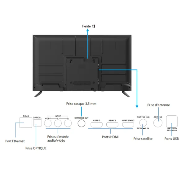 Avec cette télévision, profitez d’une polyvalence maximale grâce à ses nombreuses connectiques. Branchez vos appareils facilement via les 3 prises HDMI idéales pour votre box TV et consoles de jeux. Les 2 ports USB, quant à eux, vous permettent de lire des vidéos ou afficher des photos en toute simplicité. Vous trouverez également une prise optique parfaite pour connecter un home cinéma ou une barre de son afin de bénéficier d’une qualité audio exceptionnelle. Et ce n’est pas tout : le support mural compatible Vesa 200 x 200 mm permet une installation pratique et élégante.